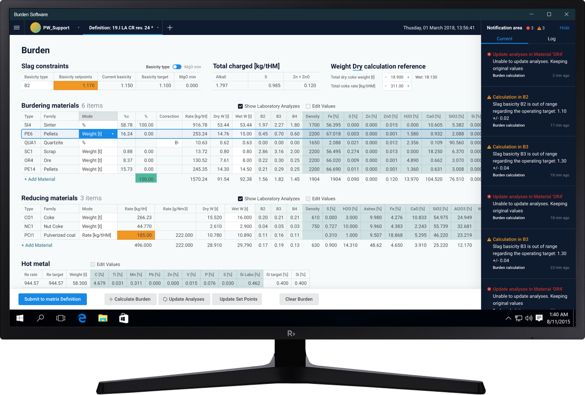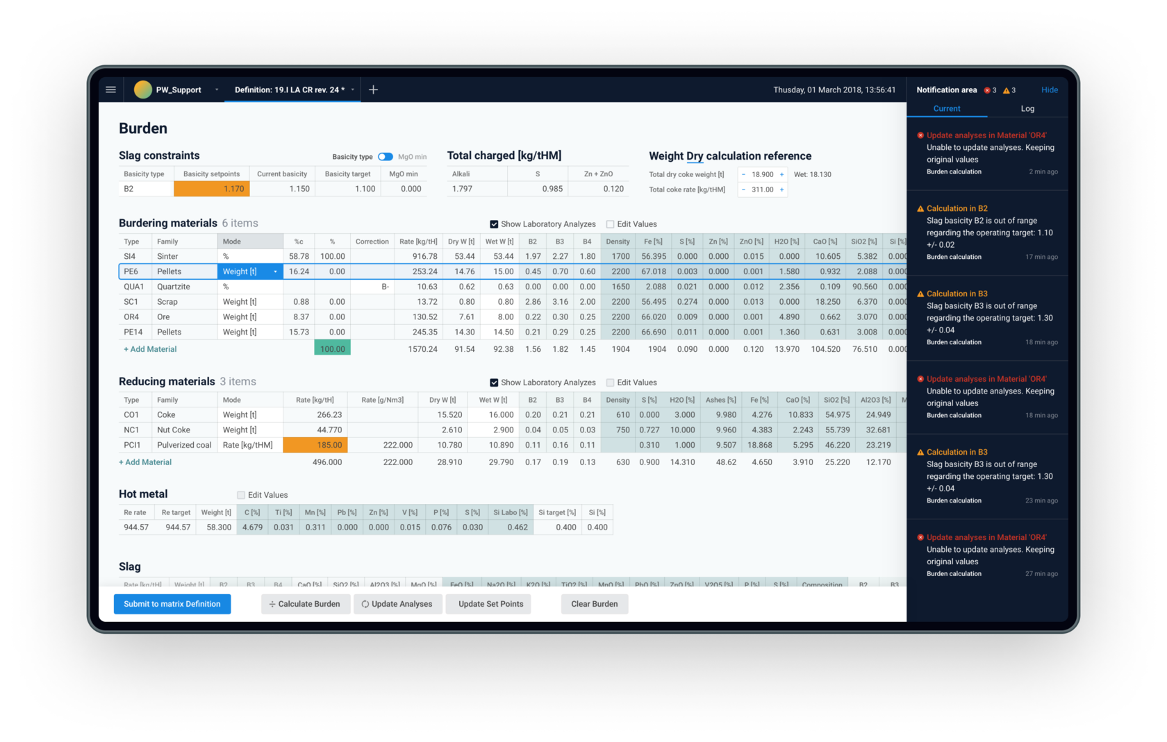 Before launching a recipe on the production line, an operator needs to verify that the composition of each material is within normal limits to ensure that the output metal quality will meet the standards. Any errors the system finds during the verification process are displayed in the notifications panel.